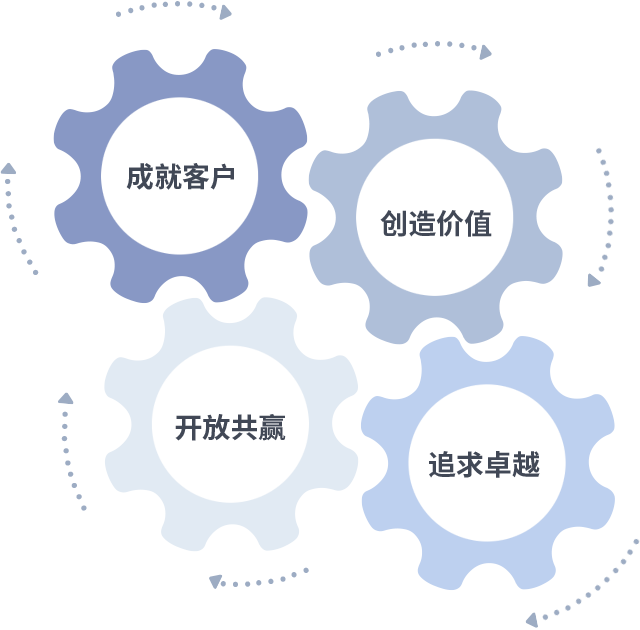 成就客户是一切决策的出发点,创造价值是衡量所有工作的标准,追求卓越是金鼎国际做事做人的态度,开放共赢是金鼎国际的格局也是最终的结果。价值观的齿轮环环相扣,推动着组织里的每个人不断向前。